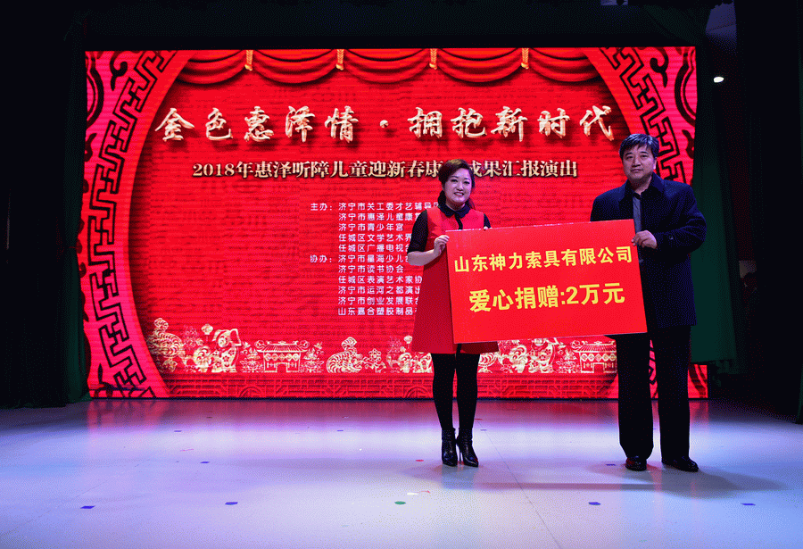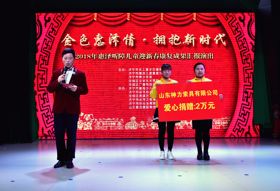 為迎接2018年新春佳節,2月7日上午,濟寧市惠澤兒童康復中心隆重舉行了“金色惠澤情  擁抱新時代”2018年惠澤聽障迎新春康復成果匯報會。濟寧市原人大許謙迎主任、關工委等相關部門負責人及愛心人士、愛心企業家與康復中心的師生一起參加了迎新春匯報會。我公司董事長杜亞中先生受邀,董事長委派公司工會主席李廣德同志代表參加活動,并捐贈2萬元的善款,為殘疾兒童康復事業貢獻微薄之力。